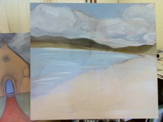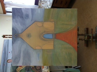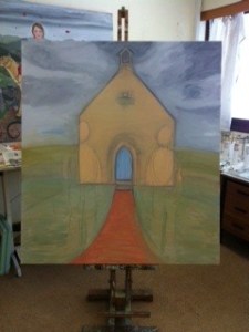 In a moment of clarity in the studio yesterday, I worked out that most of my images talk about female power. I was musing about the church image, and thinking that I may try painting a 3/4 view of the building, showing some nice sandstone details along the side. But for some reason I couldn’t break away from the image of the church, with a centrally placed door, and a curving path leading up to the entrance. Eventually I decided that the door acts as a kind of female phallic symbol, both a literal and a metaphorical gateway.