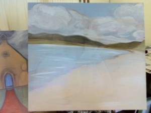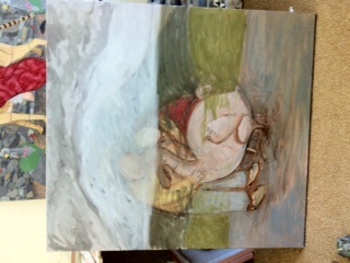 Here’s the underpainting of another image, it will eventually depict two girls standing on a beach, wearing colonial era ball gowns and animal masks. One will have her hands raised, pushing the mask off her face (perceiving the history of the place), a pose that dates back, at least in my imagination, to Les Demoiselles d’Avignon. I’m looking forward to this painting, imagining it as gelato coloured, all light pink, olive green, white and pale grey.