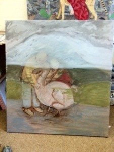 In other news, I’ve repainted the background to the Dodo with children in snowstorm image (it will probably have a better title eventually, but that’s its working name). I wanted the three figures to form a triangle, and visually operate as a pieta, with the human figures a descending series of forms curved over the dodo, the solid base of the triangle. Anyway, the whole group was off centre, and it wasn’t working.