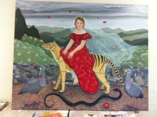 Surprisingly, one of my favourite parts of Tiger Bride was painting the lace. If you get up close, there’s some quite odd symbols and patterns woven into the pattern, including Pacific tribal motifs and things that look like crop circles. In retrospect, the lace looked better when parts of it were left sheer, as opposed to covered with ’embroidery’, but I went a bit OCD and didn’t notice this until I’d finished. At this stage I thinking that I can use lace as the visual motif that ties this exhibition together: I like the way it both obscures and consolidates forms. Incidentally the exhibition that these paintings are for, Strange Tales, has been moved back a couple of months. It will now open at Despard Gallery, Tasmania, in late April 2012.