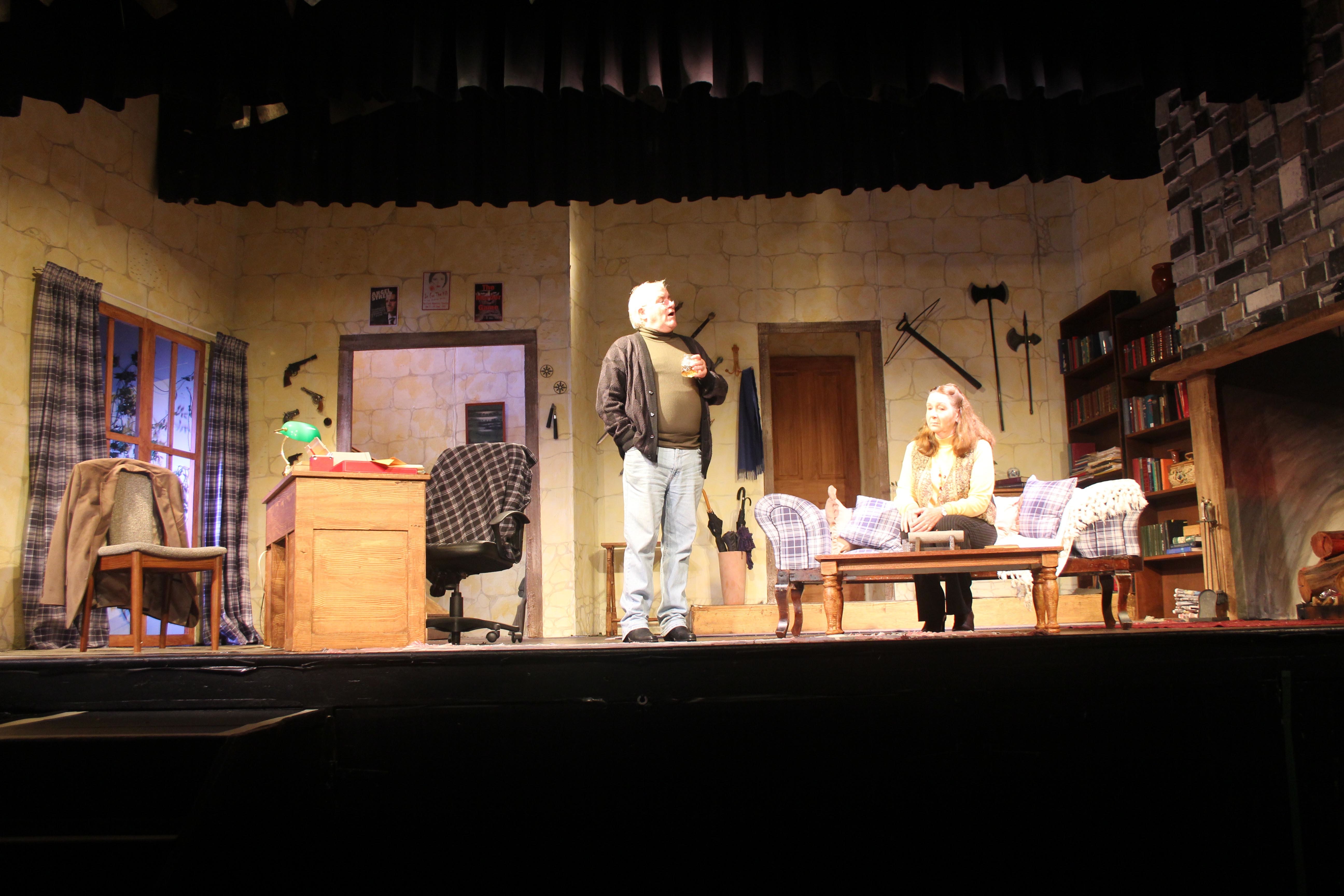 Deathtrap is set in a converted barn, circa late 1970s, hung with Sidney’s weapon collection and props from his previous thrillers. It’s a dangerous looking space, with swords, knives, guns, handcuffs and daggers all on display. At one point Sidney quips “what’s the good of owning a mace if you don’t get to use it occasionally?’ On one side of the stage is a large fireplace; antiques, bookshelves and a writing desk furnish the room.