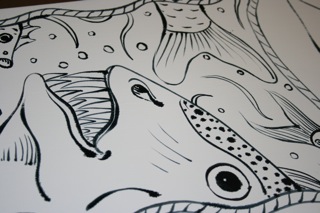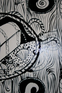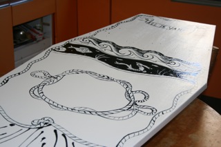 Occasinally friendships propel you into difficult territory. As a case in point, my lovely artist mate Karen Smith recently asked me to take part in an exhibition of painted coffin lids. This creeped me out to the degree that I (1) refused to participate and (2) when worn down by Karen’s nagging, said ‘yes’ but didn’t actually do anything until the last minute. I wasn’t the only one alarmed by the subject matter. I left the coffin lid in my office during the holidays, so I didn’t have to deal with it, and when I came back someone politely said words to the effect ‘get it the hell out of here’. Having procastinated thus far, I ended up painting the lid on my kitchen table, and it was still wet when the exhibition opened: sorry Karen!