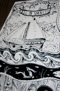 Strangely enough, once I got over my initial combination of superstition, paranoia, fear and dread, I found this project really intriguing. A life coach once gave me an exercise- imagine you are at your own funeral: what do you hope people say about you?- as a way of focussing on what I thought was most important in my life. The coffin lid did the same thing. It is based on one of my favourite books, Moby Dick, and my love of scrimshaw.
