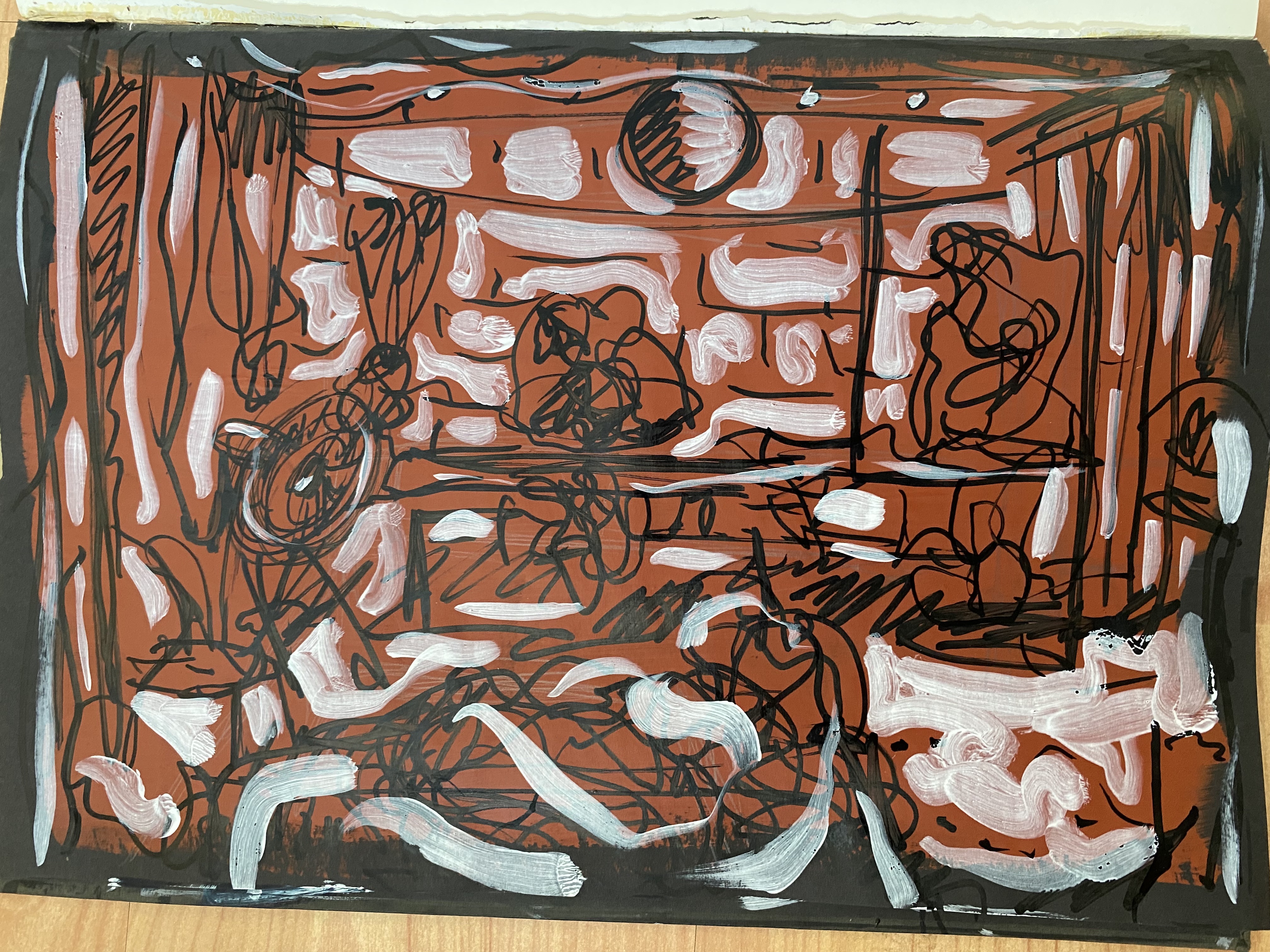 I had one last piece of paper left in my favourite sketchbook. It was actually a black piece of paper, right at the end of the book, kind of like a title page in a book. The previous day I’d primed it with some leftover reddish-brown paint. Tired, not caring, wanting to finish off the book, and not waste precious time with a model, I scribbled away with a black pen then packed up and went home. Strangely enough, it ended up being my favourite drawing of the night – there’s a frenetic looseness and lack of fussiness that you only seem to get when the conscious mind has checked out. White highlights were added later in the studio at home. I don’t usually name life drawings but this one’s called ‘beautiful girl’.